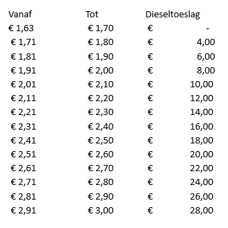 Elke vrijdag stellen wij de actuele dieselprijs vast op basis van de cijfers van Transport en Logistiek Nederland (TLN). De bijbehorende toeslag wordt vervolgens vanaf de eerstvolgende maandag toegepast. Wanneer de dieselprijs daalt naar het basisniveau, vervalt de toeslag automatisch.
